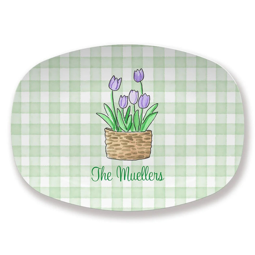 These platters are made from Thermosaf® resin and are shatterproof, microwaveable, dishwasher safe and oven safe. BPA free, melamine free, and Made in the USA. Size 10x14" and 7/8" deep. Choose border color (where applicable), font and personalization colors.