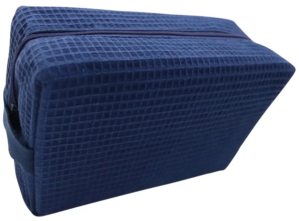 Classic style cotton waffle weave large cosmetic bag with plastic wipeable lining and inside pocket.